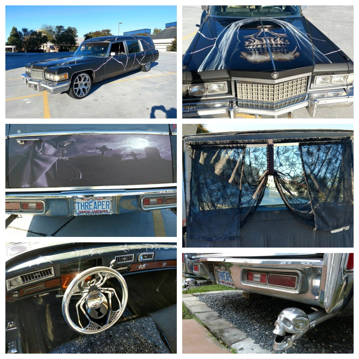 Along with putting work into the 500ci Cadillac big block engine, the birth of The Reaper Halloween hearse also included an all new black wrap with custom graphics by HD Wrapz, all new carpeting, handmade spiderweb curtains with a matching dash, a custom made billet steering wheel in the shape of a black widow spider and chrome dub 22” rims along with a chrome skeleton head exhaust tip, installed by 64 Tires and Automotive.