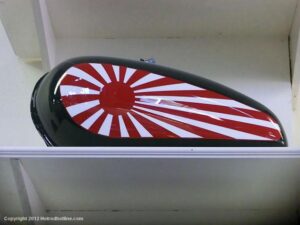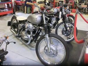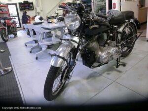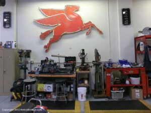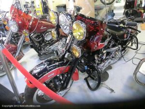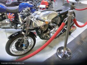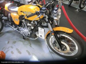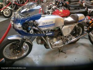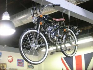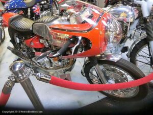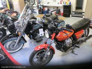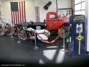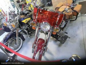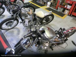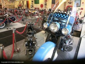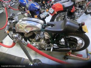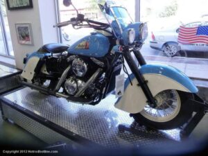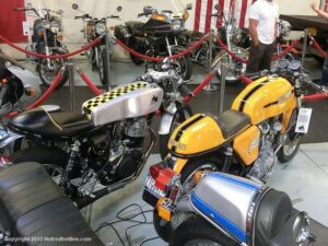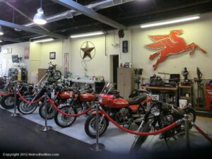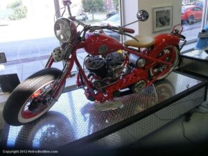 Who would think I would find Billy Joel’s motorcycle collection and exhibit space called “20th Century Cycles” while attending a local cruise nite. This is his collection of some 60 plus bikes lined up in neat rows, each a story on its own, where the important icons of their day are well represented with names like Ducati, Yamaha, Honda, BMW, Royal Enfield, BSA, Triumph, Harley Davidson, Moto Guzzi and others, leaning on their kick stands each a customized contender! All housed in a former Ford dealership on Audrey Avenue. Besides the bikes this showroom with the character of a clubhouse/art gallery including a neon jukebox, Coke machines and Old gas pumps just to name a few.