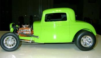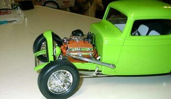 Ron likes the uniqueness of the 1/8 scale 32’s and he tries to build them righteous. Ron said, the ’32 three window Coupe with the flathead was assembled with real-to-scale miniature brass bolts, (quite expensive on his budget), and plumbed with aluminum brake lines, fuel lines, etc. He said it will always be his second favorite car, his first being the black full-fendered roadster. Ron also said, the pro-street sublime green three window has been a real blast to build, especially the detail work on the chassis. (Still in progress, 95% complete). |