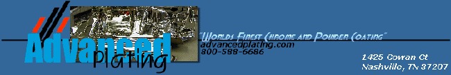 Advanced Plating is the source for show quality chrome plating. Plating on all types of material, Steel, Aluminum, Brass & Potmetal. We offer Chrome, Copper, Nickel, 24kt. Gold, Black Chrome, Satin & Brushed finishes, Powder Coating and plating on some plastic & fiberglass. Difficult Bumper, grill repair & Potmetal Restoration a specialty. Look for our work on award winning cars. We also offer a complete in-house production service for high quality short to medium run polishing and plating. Our customers include: Lokar, Superbell, Heidts, Ididit, Mavel, Hagan, Comp Cams and many others. All parts are triple plated. Satisfaction Guaranteed.
