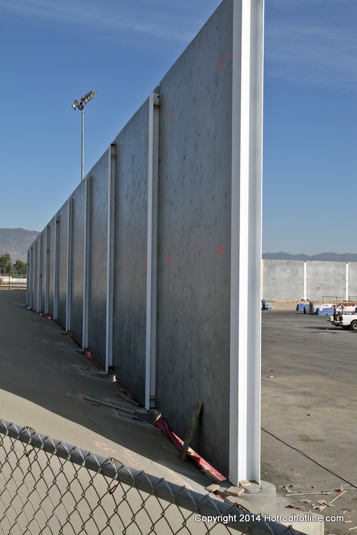 Roger Rohrdanz, Dave Lindsay and I recently made an excursion out to the Auto Club Dragway at Fontana to see for ourselves how much work has been done so that the drag strip can re-open. Roger was the dragstrip photographer prior to the closing of the drag strip. Dave Lindsay is the owner/publisher of www.SoCalCarCulture.com that provides information on car shows and events throughout Southern California. It is a website that is very important to check in order to plan your itinerary. Litigation by homeowners prompted a judge to order the closing of the drag strip until an environmental impact report could be prepared and acted upon by the court. A sound wall was proposed as a way to satisfy the intent of the law at a cost exceeding one million dollars and the judge authorized the reopening of the drag strip. This came as a welcome relief to Southern California drag racers that had recently lost Irwindale Speedway’s drag strip when the promoters went into bankruptcy. Irwindale has since reopened and now provides 1/8 mile public drag racing. The Auto Club of Southern California Dragway at Fontana, California is slated to re-open February 15, 2014, according to David Talley, Director of Communications for the Auto Club Speedway. Previously there had only been a sloping ten foot concrete wall and an eight foot chain link fence between the track and a railroad track on a further ten foot setback. Not much room for a concrete noise barrier, but engineers can design remarkable structures in such a small space.