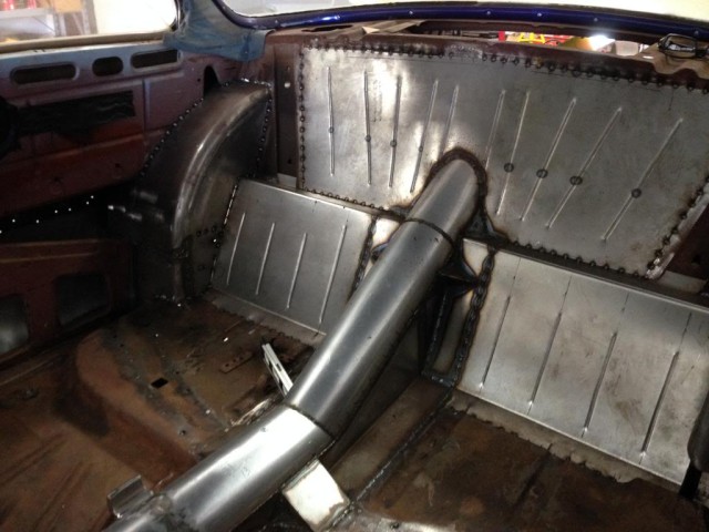With wider wheel tubs for larger tires and a beefier transmission tunnel, the interior of the car looks remarkable. The upward kink at the end of the transmission tunnel is designed to cover the third link as well, and was later covered with the seats. Pretty trick bead rolling, too.