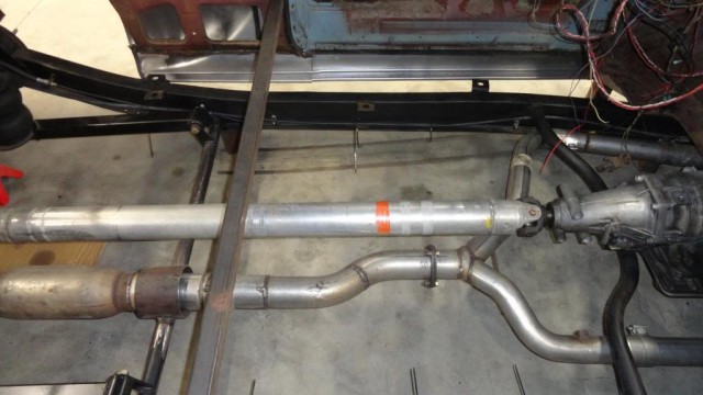 The exhaust and driveshaft combination were finished for very little, but required some ingenuity. The aluminum driveshaft was an eBay purchase, and once drove the rear wheels of a Crown Victoria. A short yoke was attached, and then the a conversion joint was used at the front end to match with the GM slip yoke to the transmission. The F-body manifolds were matched to a custom exhaust, which was then bent at two 45-degree angles and cut them to clear the driveshaft.