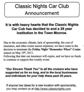 I’d been looking forward to May 3rd and hoping for good weather, because that was the date for the kickoff of the Friday cruise night season with Classic Nights Car Club in Monroe, CT. This has been one of my favorite cruise nights for many years because of the variety and quality of the cars it draws. Upon arrival, I was handed a leaflet announcing the end of the Classic Nights Cruise Nights, effective the following Friday, May 10. What could bring an end to this always well-attended 29-year institution in Fairfield County? Sadly, the simple answer is lack of funds. This year there is no sponsor for the weekly cruise-ins, and the car club can’t afford the cost of the event insurance on its own. With rain now in the forecast for May 10, and the club’s insurance expiring shortly thereafter, we may have just attended the last ever Village Square Cruise Night. I hope I’ll be able to report later in the season that a sponsor stepped up and Classic Nights Car Club will then be able to continue this long-standing Friday cruise night.