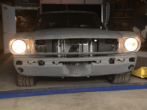 A ‘64.5 Mustang would do. When he grabbed the car, it was missing a motor and transmission. Despite looking quite nice and having very little rust, it still needed plenty of work. So, Dan first stripped the car down to a shell, sandblasted everything and covered it in epoxy primer. The 50-year-old-car needed a floor pan replacement and a quarter panel, but that was mostly it. With some impressive metalworking skills, Dan built a rotisserie to work on the car and used it to help weld in his frame ties and fit his torque boxes.