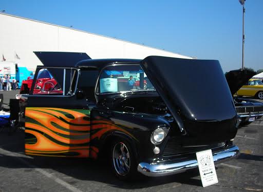 Front end is a 1955 Cameo hood and fenders and also has a custom grille. The custom hood opens in reverse, work was done by No-Limit Engineering. A custom 16 gallon gas tank has been installed under the bed with a fill through floor mechanism. The fiberglass bed of the truck with a custom tailgate has a solid oak wood floor that was left over from the 1906 San Francisco Fire which is coated with high gloss polyurethane. Custom bed cover with locking mechanism is by Gaylord painted to match, carpeted on the underside.