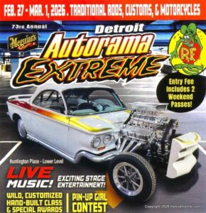 2/28/2026 Huntington Place-lower Level, Detroit, MI Detroit Autorama Extreme was held in the 100,000 sq. ft. lower level of Huntington Place Feb. 27-Mar. 1, 2026, and featured more than 200 Traditional Hot Rods, Customs, and Bobber Bikes. There was continuous entertainment by a half dozen live bands, Miss Autorama Pin-up Contest, Artists and many Vendors. Celebrity Pic Awards were on Saturday and Class Awards on Sunday. Fun for Everyone!