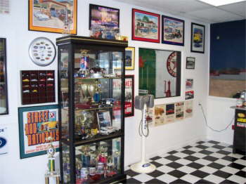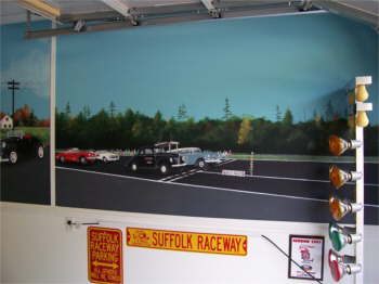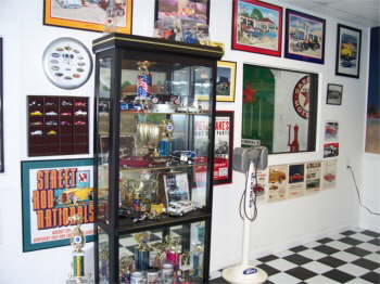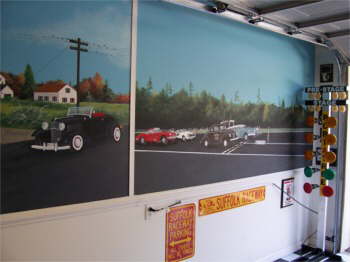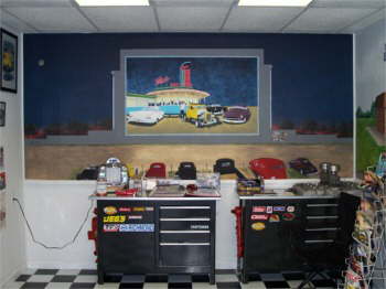 Spencer’s Showroom for his 1941 Ford Pickup. We had murals painted on the wall, a lot about our life. As you drive in the room you face a drive-in movie. American Graffiti is playing and all the cars from the movie are painted parked at Mel’s Diner. The cars parked at the movie are a few of our friend’s cars. |