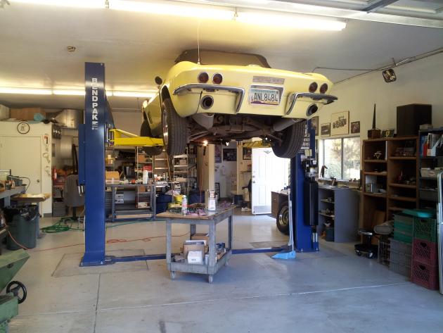 My ’55 Chevy at rest in my home machine shop. 1500 sq ft., heated and cooled.  Friend’s cars in the air.   Moe Marasco’s Shop Phoenix, Arizona Car Images: