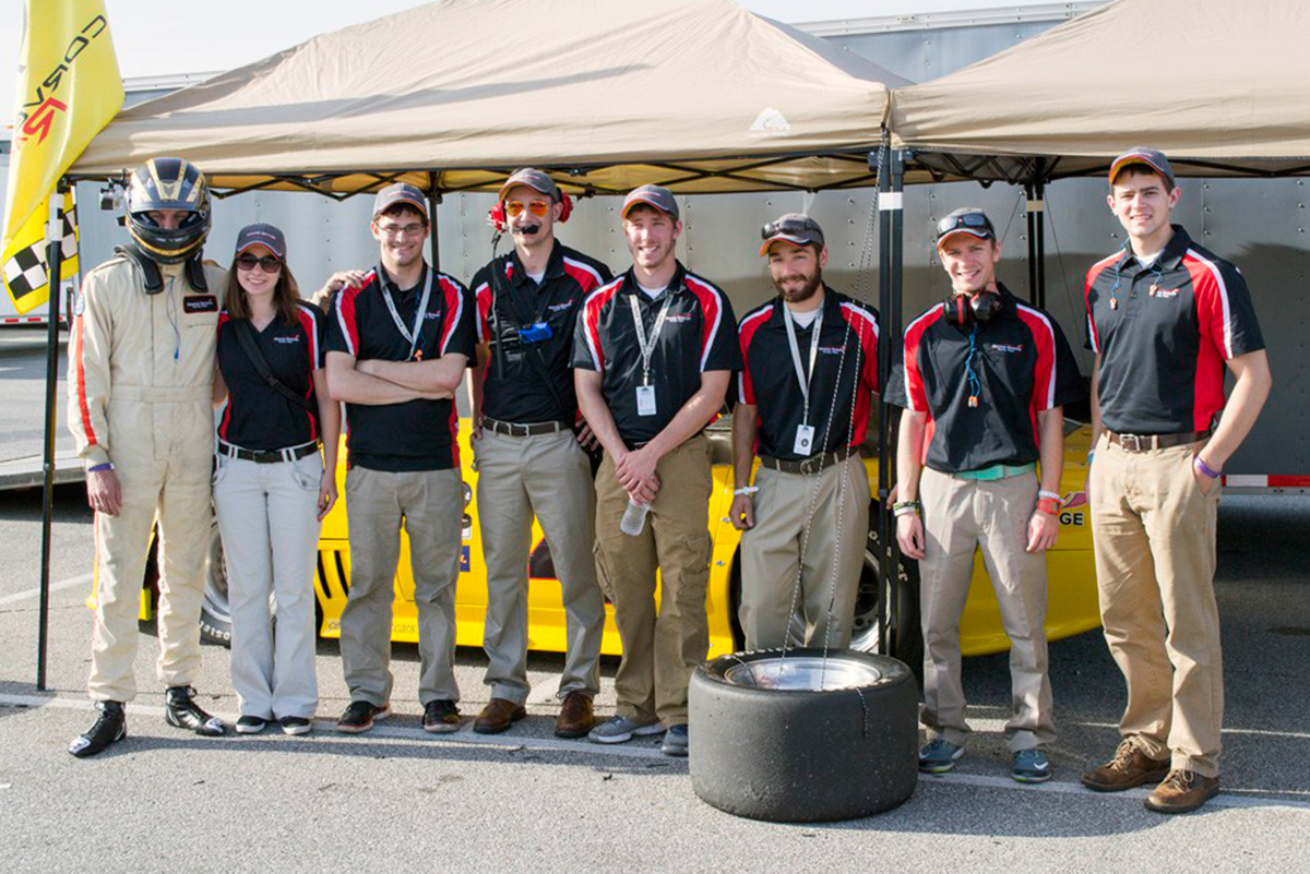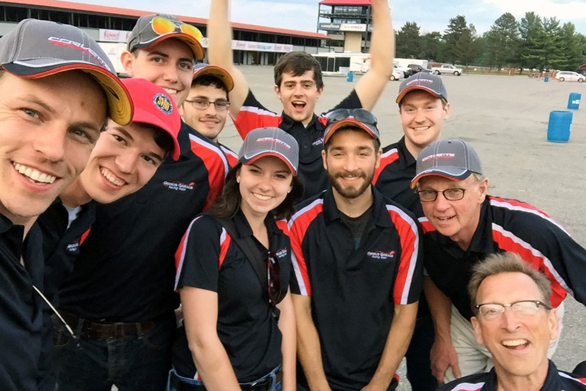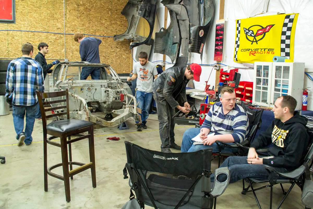 Students work on the Corvette at the track.