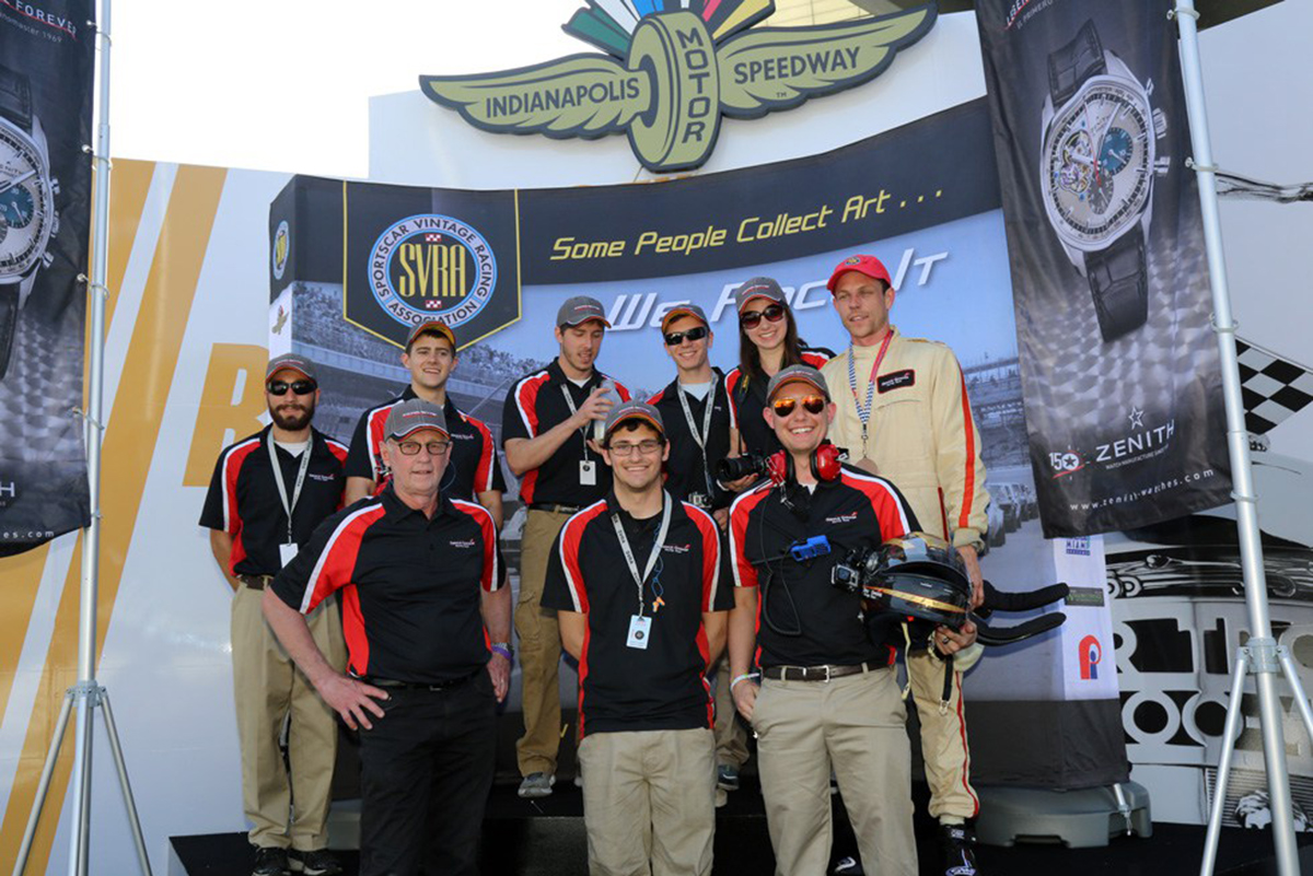 Students pose at the Indianapolis Motor Speedway with program mentors and driver.
