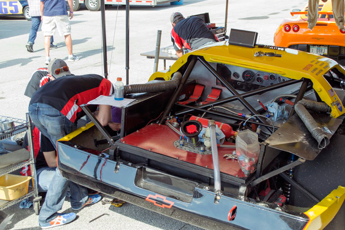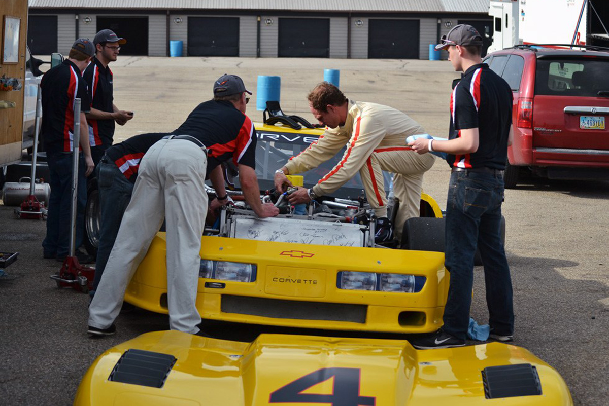 Pre-race adjustments to the SVRA 1988 Corvette GTO the students built.