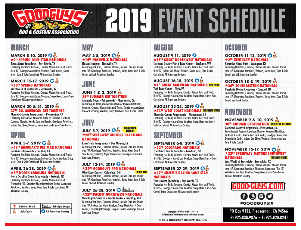 Goodguys 2019 Event Schedule Goodguys is celebrating 36 years of shows, swaps, rodding and revving this year! Check out the schedule of events and start to plan your year accordingly! By hrhwp hi this is my bio. :) View all of hrhwp's posts.