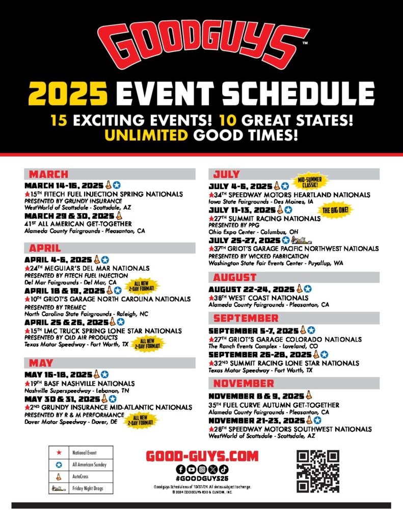 The 2025 Goodguys Rod and Custom Association event schedule for 2025 is jam-packed with old favorites, and the return of the Grundy Insurance Mid-Atlantic Nationals in Dover, DE. Check out all the details here: https://www.good-guys.com/events/2025-events