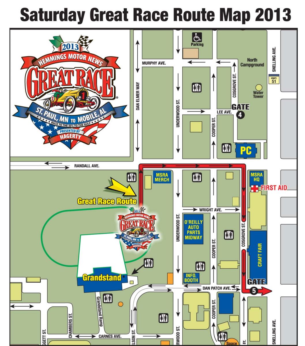 Saturday morning they will complete their final preparations for the Great Race’s Grand Start at 50′s. The starting line-up, beginning at 10:30 am, will take competitors from the racetrack on a route through the event, leading them to the Minnesota State Fairgrounds Main Gate at Snelling and Dan Patch Avenues where the Grand Start ceremonies will take place at 11:00 am.
