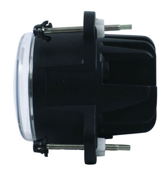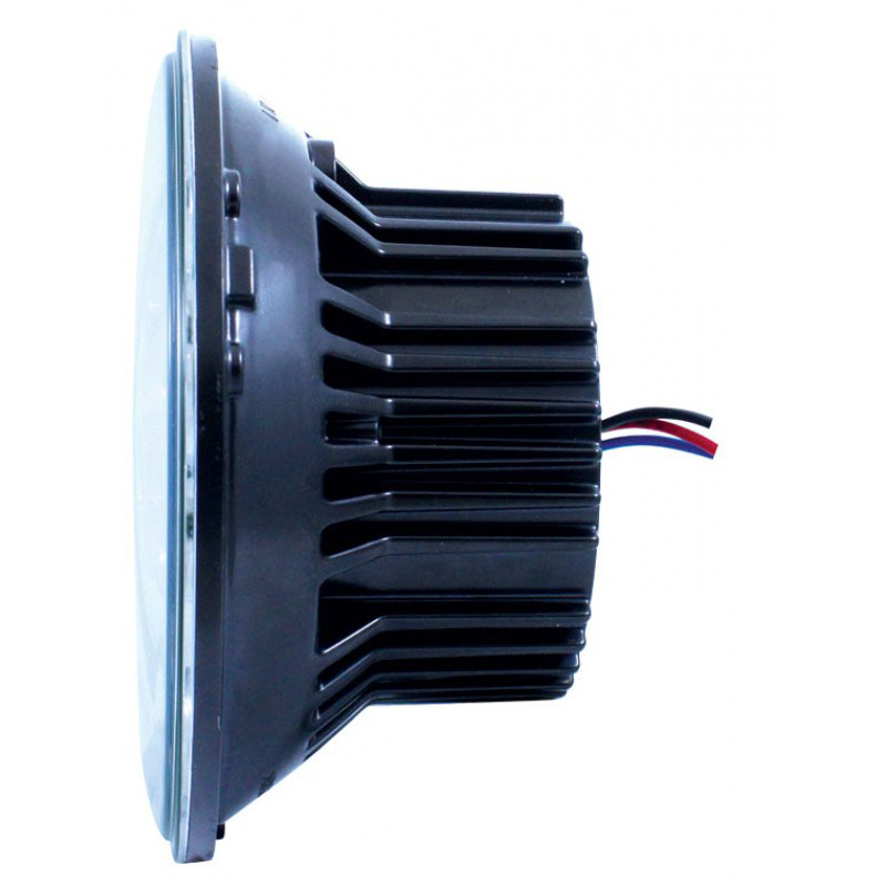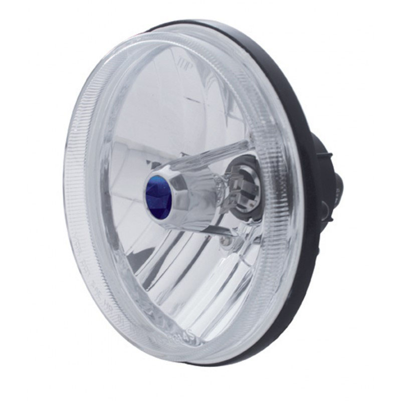 Replaceable-bulb composite headlamps like the 7-inch round unit from United Pacific shown here features lens optics and a replaceable bulb that installs at the rear of the reflector. The most popular replaceable bulb in use in the US is the Tungsten-halogen (quartz-halogen) H4 type bulb with standard three-prong contacts like the ones on sealed beam headlamps. Other tungsten halogen replaceable-type bulbs are available with a different type of connector and a different H-number designation. Replaceable-bulb composite headlamps can have clear lenses without lens optics like the unit shown with the blue-dot in the center (not for highway use in every jurisdictions).