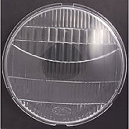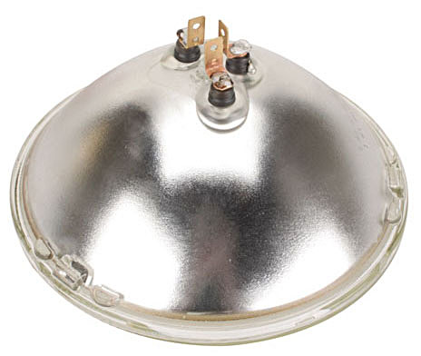 This is the standard 7-inch round sealed beam headlamp with fresnel and prism optics molded into the inside surface of the integral lens. Standard three-prong molded plug fits over the contacts permanently attached to the filament wires coming out of the sealed unit.