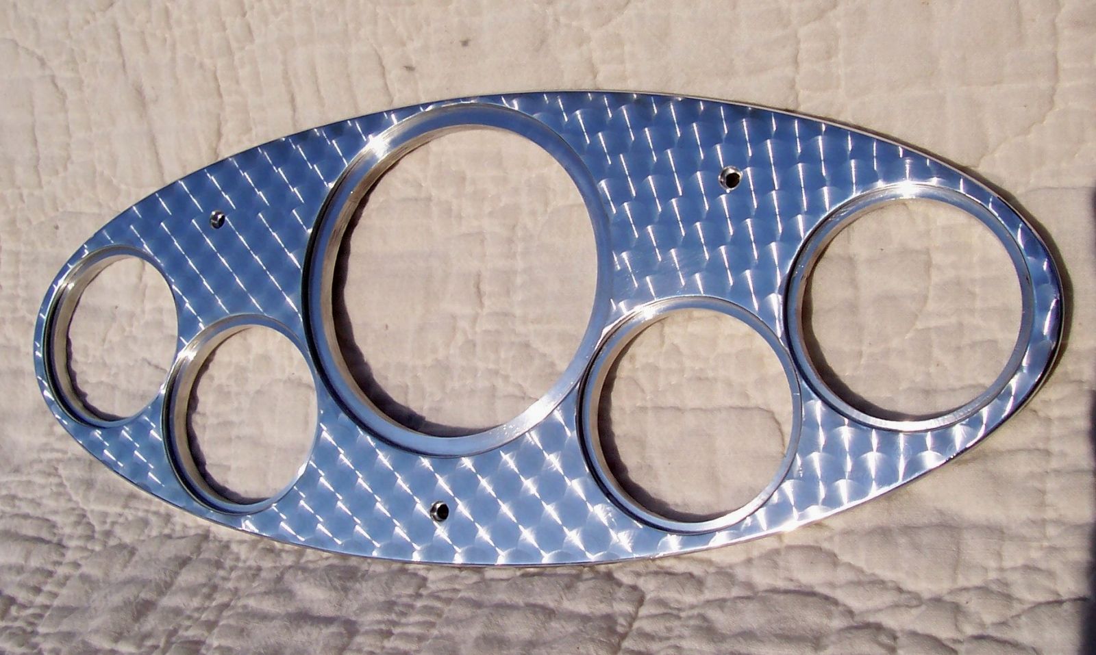 Shown in this product feature is our #1596 “Traditional Series” 32 Ford dash insert, available in brushed, polished & engine turned finishes. This insert will fit into the stock oval opening of an original or after market 32 Ford dashboard. Three manufacturers, Stewart Warner, VDO & Speedhut offer 2 1/16” & 3 3/8” gauging that will fit into the small confines of the stock 32 oval opening. This insert, due to its size limitations will fit all 5 gauge kits, from all manufactures using a 3 1/8” speedometer. When ordering the 2 hole insert, all 3 3/8” gauging from any manufacturer will fit.