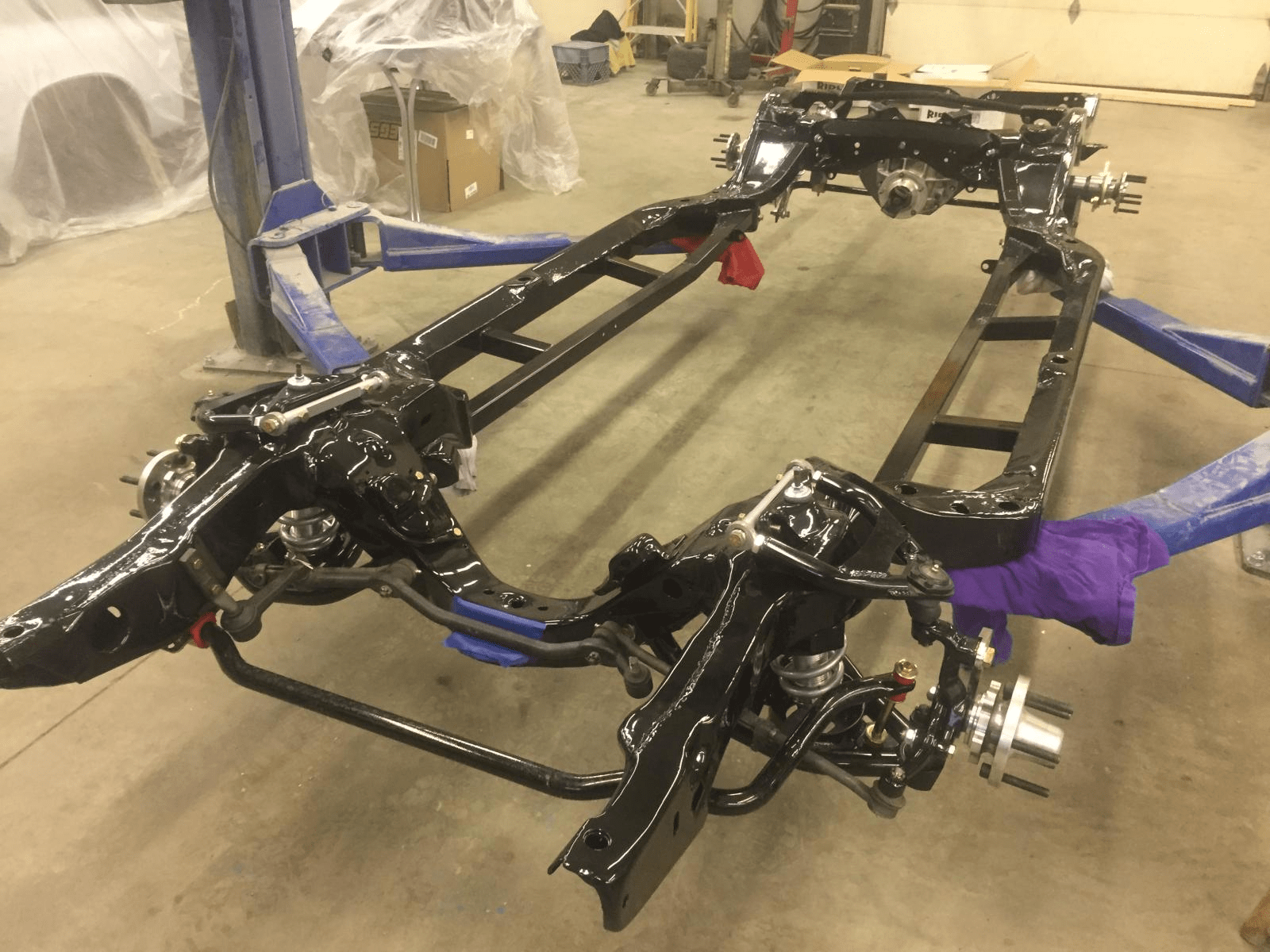 When the frame came back from getting powdercoated, he started mounting up the rest of the UMI Stage 5 suspension, Kore3 Z06 brakes, and 9” rear. Along with a Trutrac and 35- spline axles from Moser, this rear end should have no difficulty harnessing and administering the power produced by that wild 416 and sent through a beefy 4l80e.