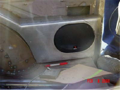 | Here are a couple pics of work currently being done. Speaker installation both front and rear, with remainder of components to be in the trunk area |