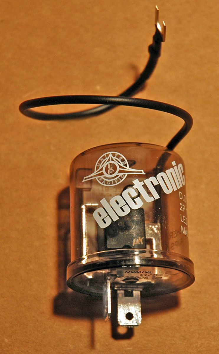 A conventional thermal turn signal flasher will generally continue to work with LED taillights as long as there is a full sized (i.e. 1157) bulb in the front turn signals. If your car has tiny bulbs in the front turn signals, LED front turn signals, or no front turn signals at all, you will need a grounded turn signal flasher designed specifically for LEDs. This 2-prong grounded electronic flasher from United Pacific solves the problem. It has a ground wire that has be attached to chassis ground.