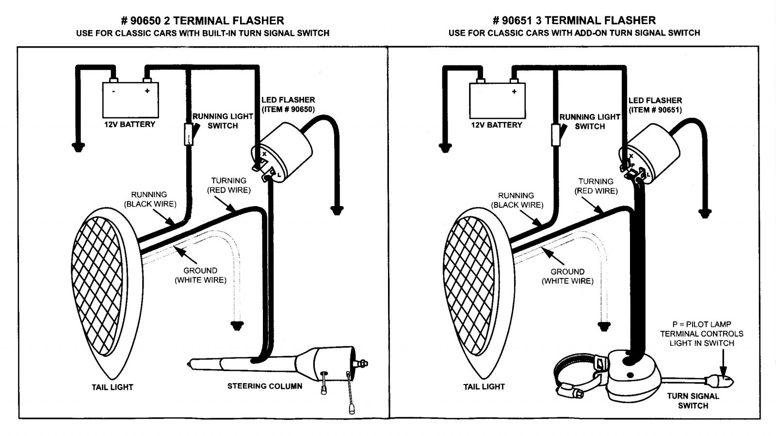 | LED Flasher w/ Polarity Reversing Adapter 12VDescriptionUse on Vehicles w/ LED TaillightsFront Turn Signals & Side MarkerSimply Replaces the Original 552 Or 536 Under Dash Flasher, Plug & PlayIncludes 2-Terminal Flasher (90650) & Polarity Reversing Adaptor (90650A)Polarity Reversing Adapter Solves Reversed Issues on Some Applications |