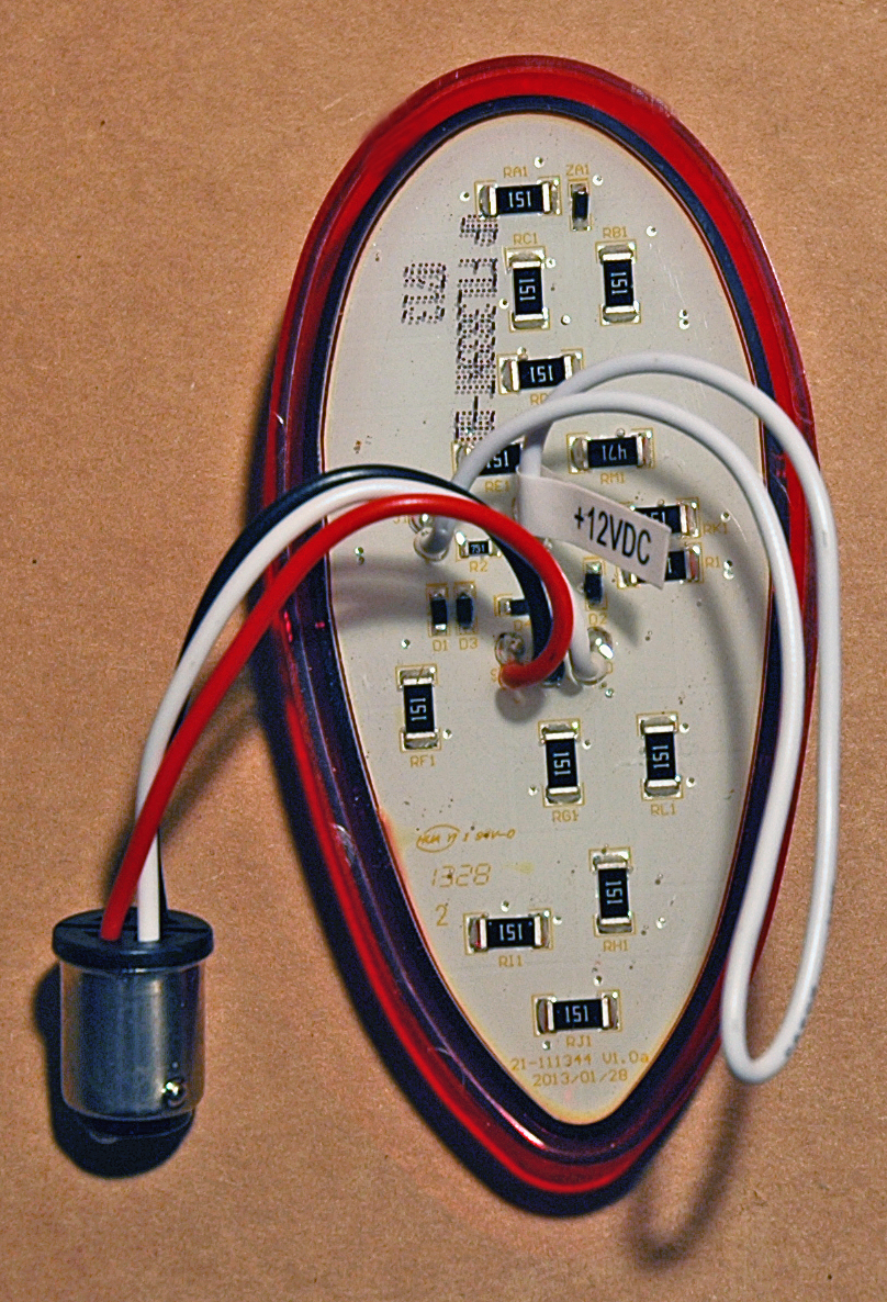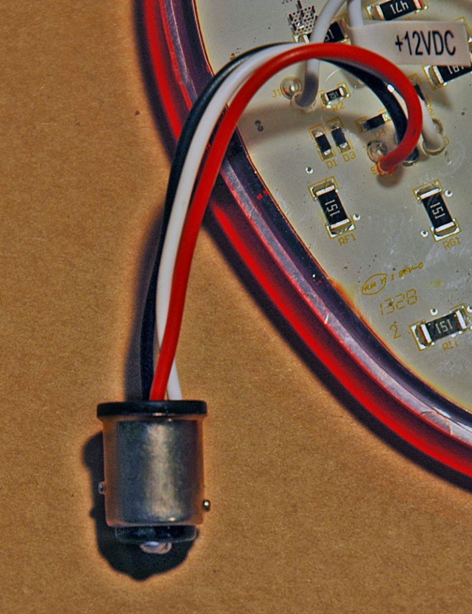 ![]() | The 1157 style base on the LED taillight just plugs into the socket the same way as the bulb. White wire is for the center blue-dot. It can be left fully functional or cut and a toggle switch installed to activate or deactivate it. |