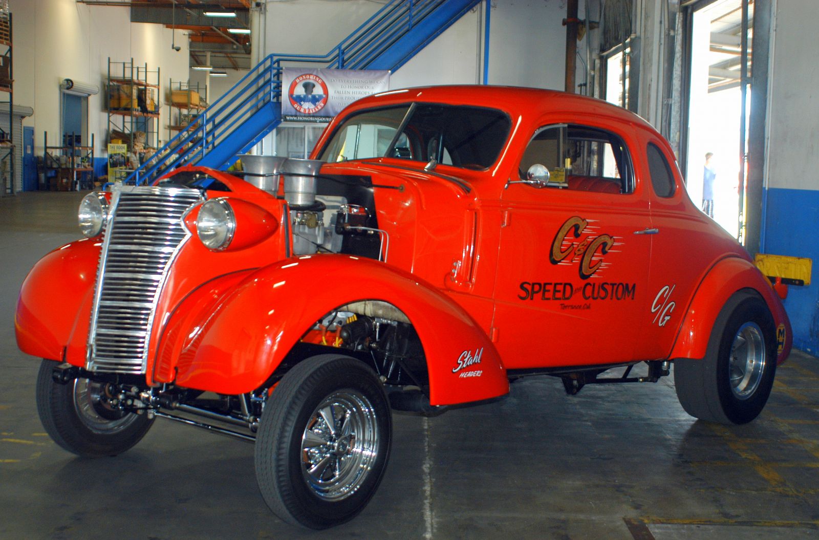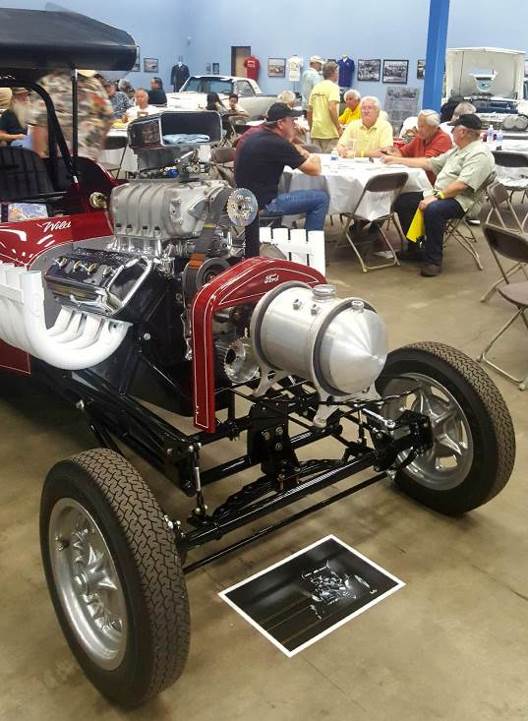 C&C Speed and Custom C Gasser’ 30s Chevy sports a pair of “nuclear powerplant” velocity stacks.