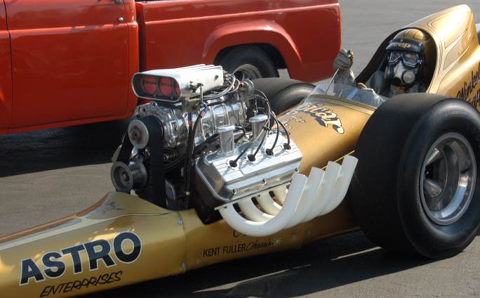 Ernie Chavez brought the oldie golden dragster Astro Enterprises to the Price Lions event. The car was originally built in 1964 by drag racing early innovator and chassis builder Kent Fuller. The car would take part in 26 races and clock a best 7.62 E.T. at 204.08 mph with ace pilot “Jumpin’ Jeep” Hampshire manning the controls. And about that gold color – the car was covered entirely in gold leaf when first built.