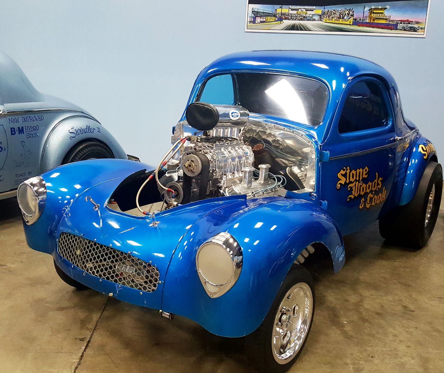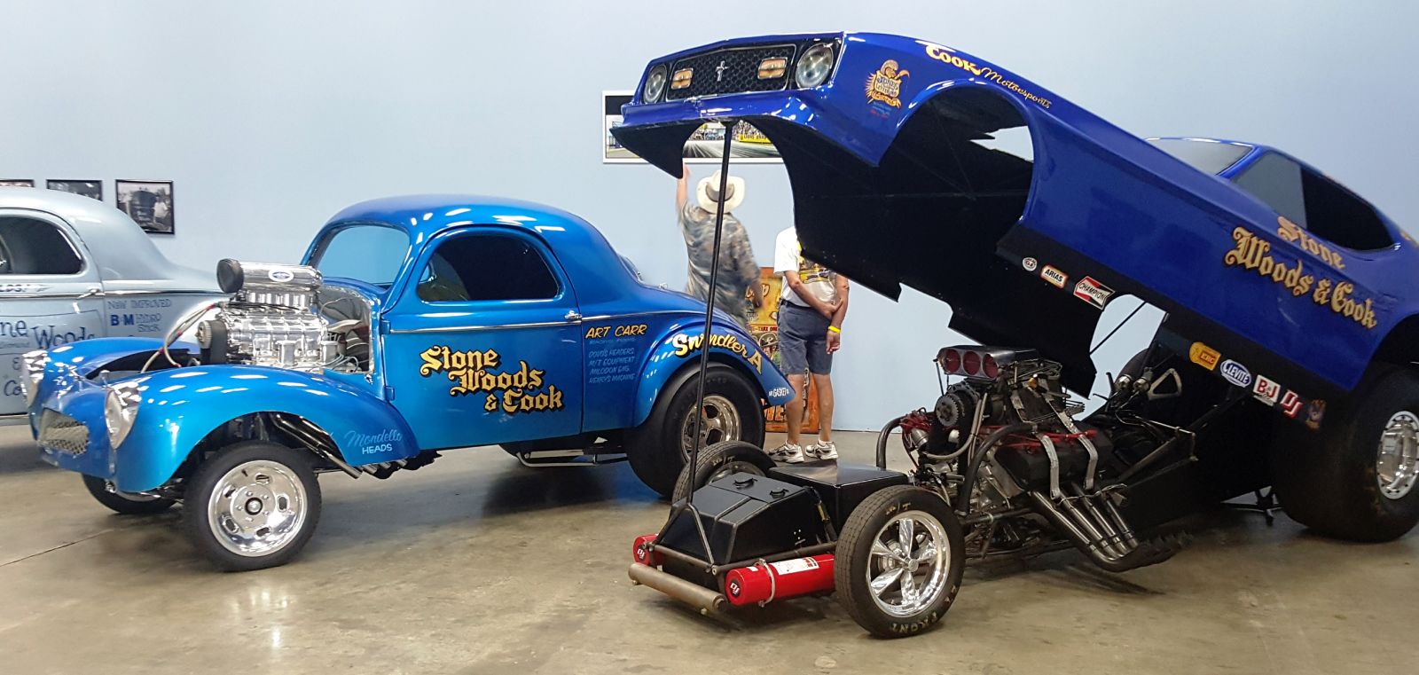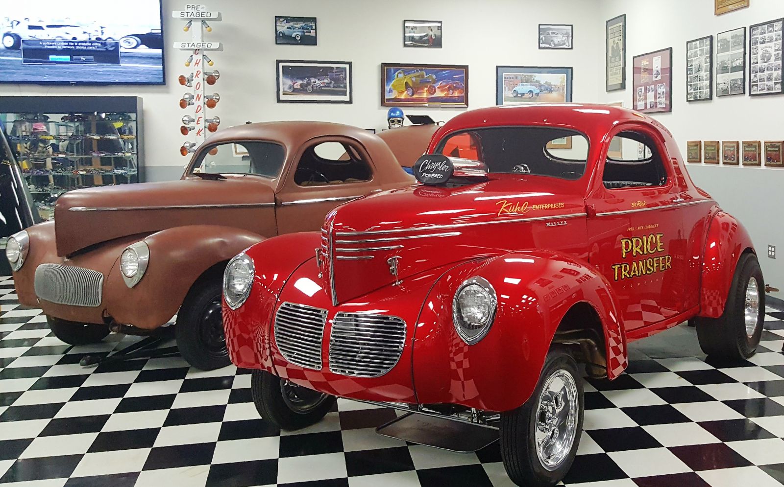 One shiny, one muted, a pair of Price Transfer dragsters owned and run by Rick Lorenzen shares the checkboard corner of one of several display areas. The 1940 Willys is powered by a Mike Kuhl built 1200 HP 392 cu. in. Chrysler Hemi. Note the “Christmas Light” dragstrip timing tree in the background.
