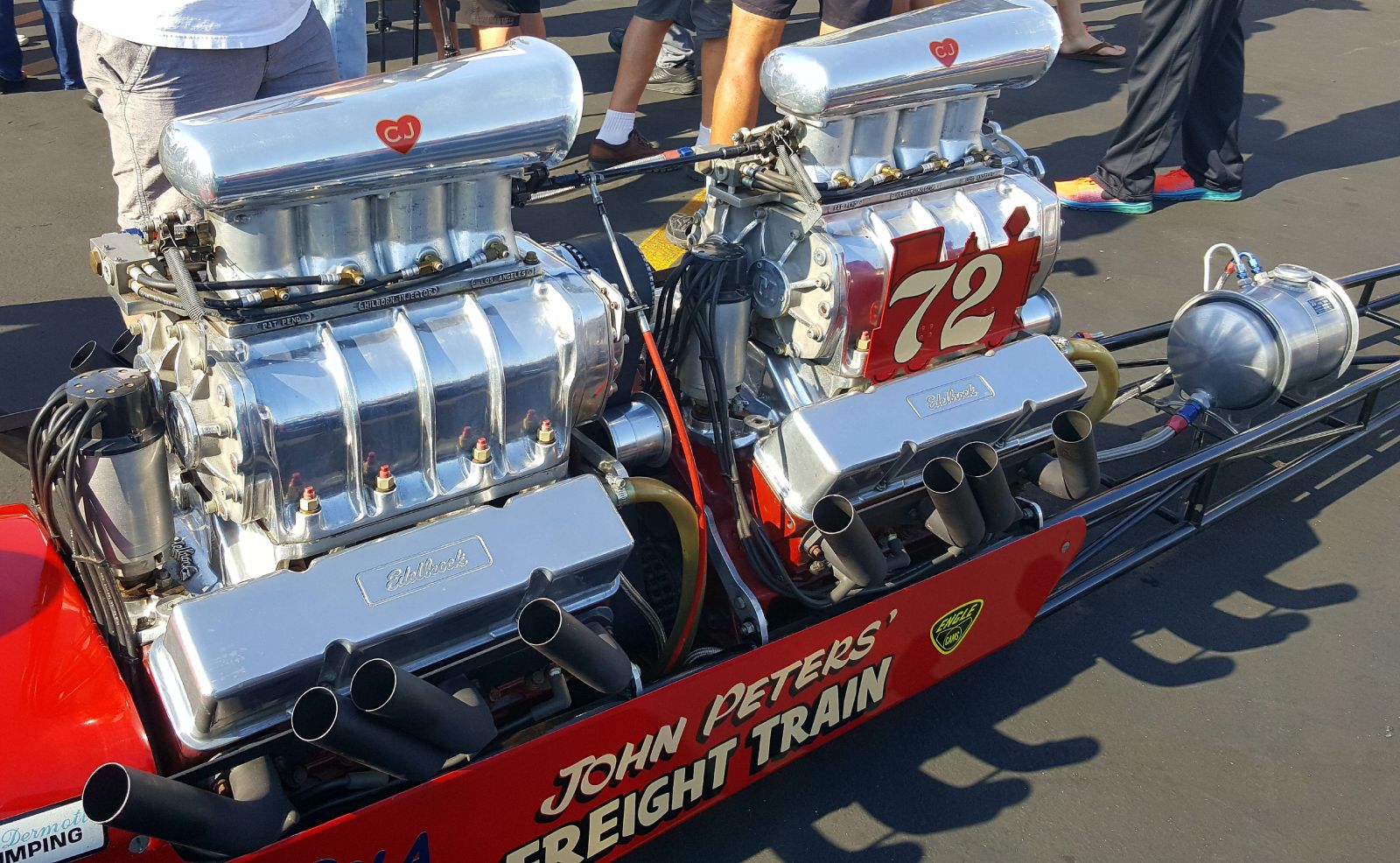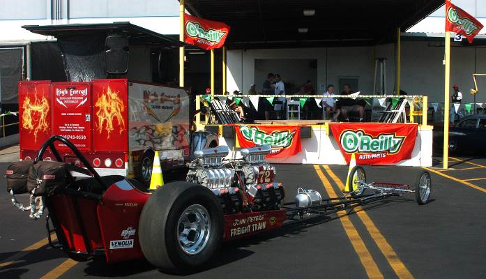 The word iconic is used too often, but it does apply to Santa Monica, CA based John and Bev Peters’ “show and go” Top Gas Dragster, named “Freight Train” for obvious reasons. Between 1960-70 John put together four of them, and in ’67 his last version took honors as the first to clock 200 mph, as well as numerous other major wins. But then, in ’71, the NHRA discontinued the Top Gas class and most racers converted or recycled their TG’s. Not John – he kept his as is. It turned out to be a good call, as Freight Train was called back to the spotlight in 1995 for the NHRA Motorsports Museum, then on to numerous other appearances, including center stage at this recent Lions museum review.