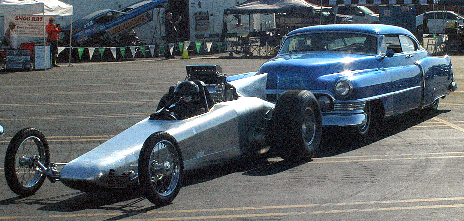 A classy ‘50s Cadillac gives a sleek vintage dragster a starting push to the line-up for the “cacklefest” wherein, the mass of Top Fuelers lit up their monster engines, producing a 10.5 on the Richter dragster scale. Drivers wore protective gear and breathing masks to prevent damage from the nitro-methane fuel. We standers-by could hold our breath and stuff our fingers into our ears… yessir, it was a hoot and a half, and much enjoyed by the crowd.