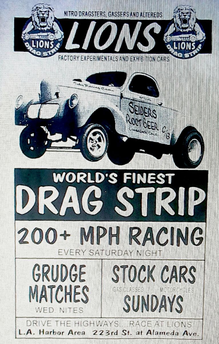 Once upon a time, specifically from October 1955 – December 1972, the ground shook not just from the freight trains rumbling to and fro, but from hi-octane fed cars burning up the quarter mile on a famous all-American raceway called Lions Drag Strip, which had been built on an abandoned train marshalling yard. While indeed it often sounded like a pride of lions was on the loose, the track was so named because of its sponsors, the equally famous Lions Clubs International, which had collaborated with an L.A. judge in seeking a safe place for kids to vent their need for speed. Following the mantra “build it and they will come,” some 10,000 young hotrod fans showed up for the first day of racing, with some 300 cars taking up the challenge.