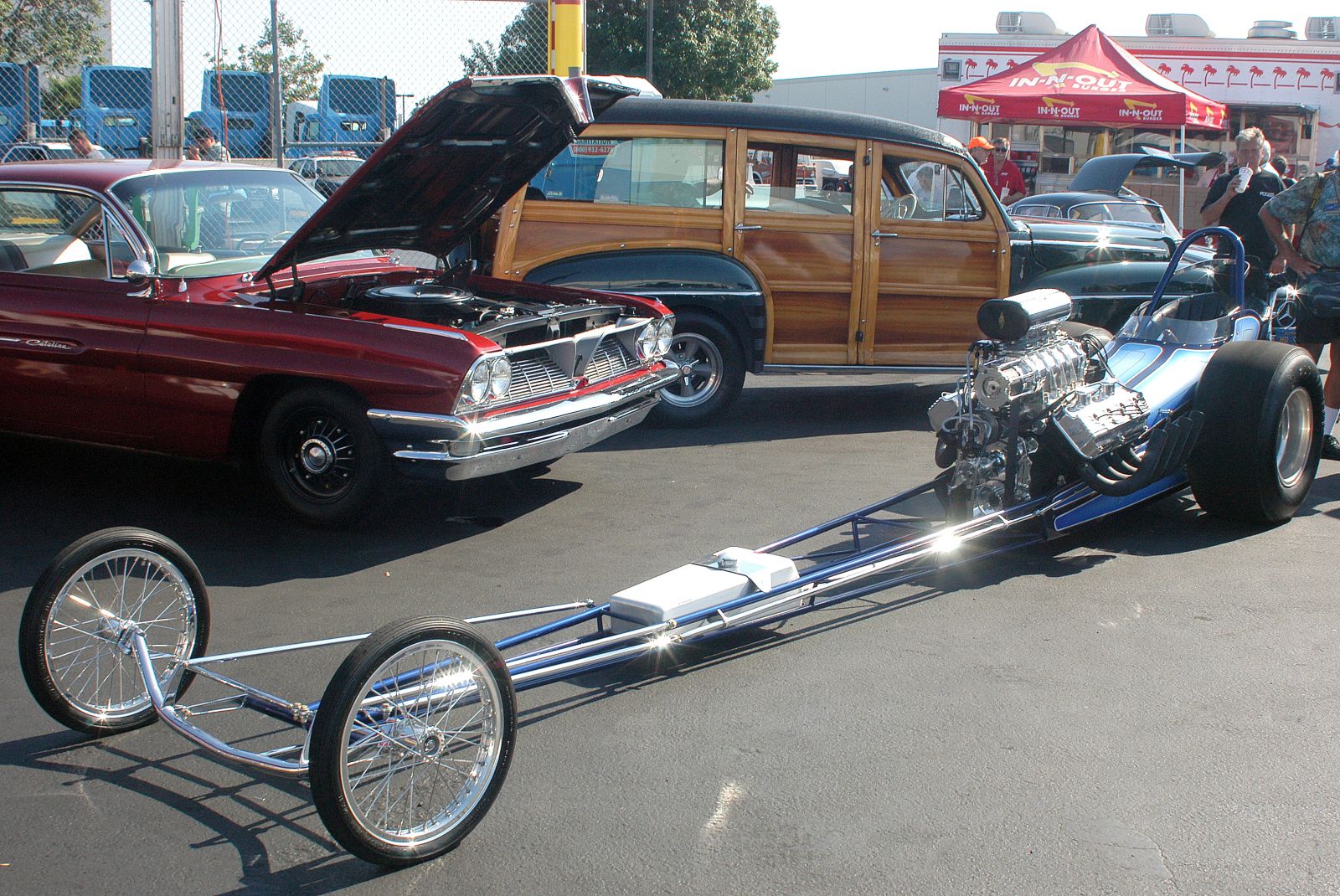 Outside the Price Transport building, the vast parking area was a sea of vintage racers, classics and customs. Careful not to trip over one of the “railers” when working your way over to the In-n-Out burger mobile kitchen, free eats part of the $35 event entry fee.