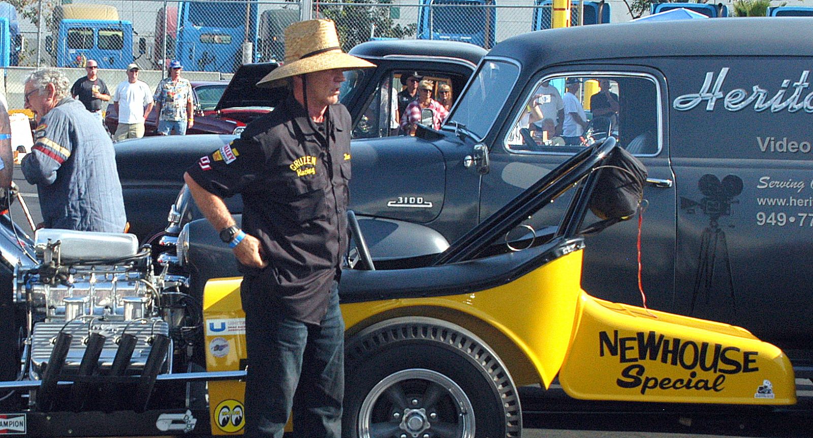 Seen here is the “cloned” Newhouse Automotive Special A/Fuel Modified Roadster, a true blast from the past. Originally owned and raced by Gary Gagle, it was sponsored by Ernest Newhouse of Newhouse Automotive. Campaigned in the early ‘60s, it later became Joel Gruzen’s labor of love to “revive” his favorite mid-60s car so he built it in the backyard of his L.A. home. The car features a ’23 T roadster body and a supercharged 299 cu. in. Chrysler powerplant. Very interesting to note that Ernest Newhouse originally earned his first money to build cars by writing a ‘50s best-selling do-it-yourself car handbook.