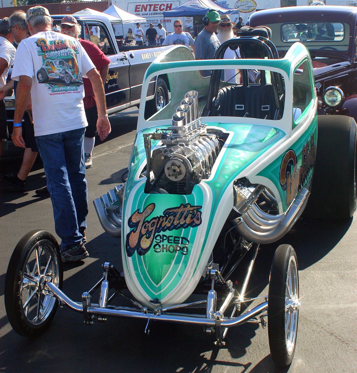 A dramatic design of upswept pipes and sequentially staggered velocity stacks highlight another dragstrip legend, the car built by the Sacramento based Don Tognotti Speed Shops. Don is also well-known for his show-winning street rods, including his “King T” car which was awarded America’s Most Beautiful Roadster at the 1964 Oakland Roadster Show. More than 50 years later, Tognotti’s Speed Shops are still in the go-fast business.