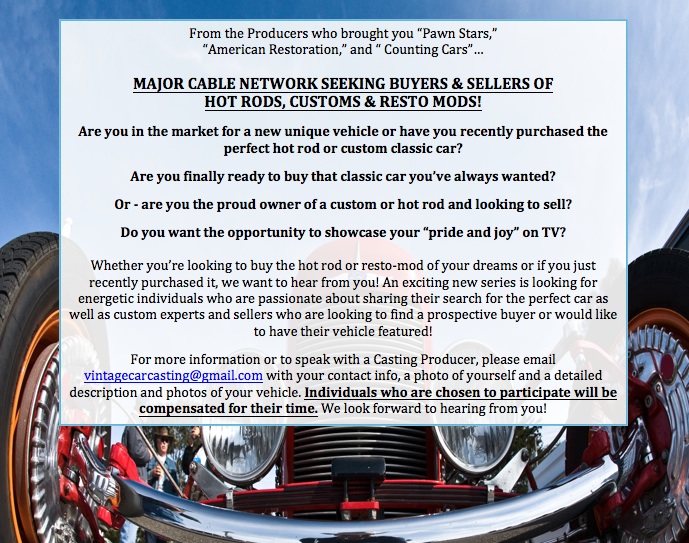 We’re currently on a nationwide search for folks who recently purchased or are about to purchase a unique, classic, custom and/or hot rod as well as car experts and sellers who are looking to find a prospective buyer or would like to have their vehicle featured. This series will follow potential car buyer’s interactions with car sellers, as they test drive and learn more about the rich history of each vehicle. Ultimately, this series aims to showcase some of the most remarkable cars on the market, as well as to follow potential buyers as they search for the custom vehicle of their dreams!