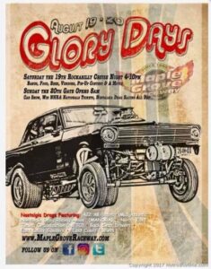 Great time at the Maple Grove Raceway’s 1st annual Glory Days Nostalgia Drags meet is a throwback to drag racing’s wild, colorful early days and includes nostalgia drag racing, a car show and oldies music. The event draws strong support from a number of nostalgia-style drag racing organizations and local racers. It started with a cruise night Saturday August 19th to kick off the Glory Days Nostalgia Drags. On the racing site we ran the Frantic Ford vs. Super Camaro in a match race to give the fans a little more WOW! Enjoy the pics!