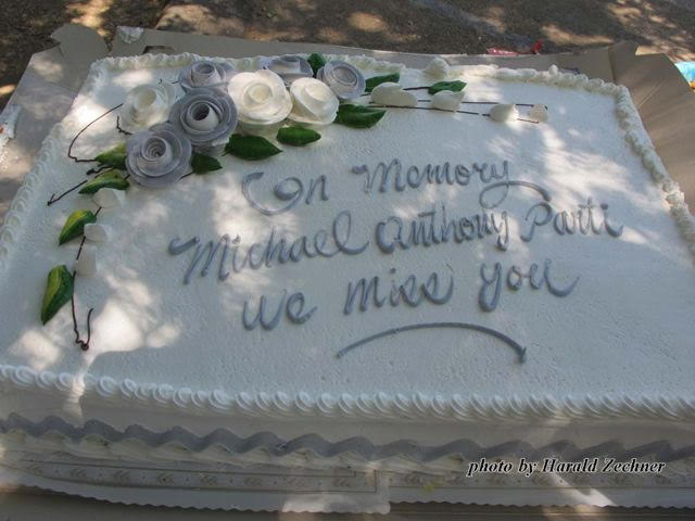 At the end of the food line stood a large desert table with cookies, cupcakes, mixed nuts and a multi layer whipped cream covered memorial cake with the inscription “In memory of Michael Anthony Parti, we miss you.” It was definite that no one would be hungry at this gathering.
