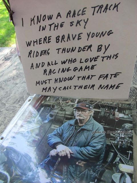 The layout was simple yet dignified. Large shade trees covered numerous tables and benches for those there to sit, talk and listen. At the front a small shrine with flowers, pictures of Mike, his racing and motorcycles. A guest book already half filled with tributes and a box of blank name tags for guest to fill out and wear.