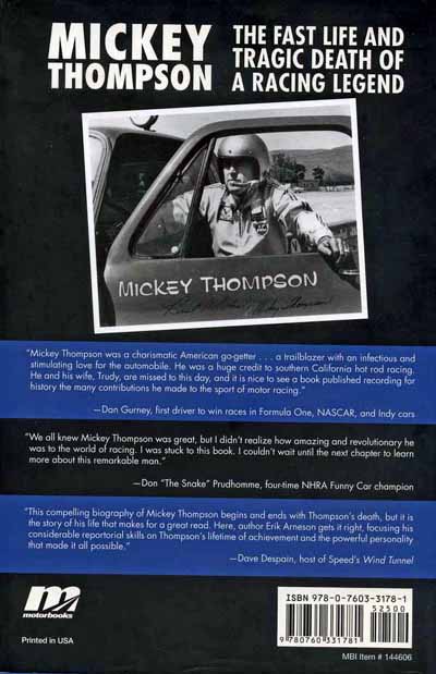 He was also forgiven by his friends and grudgingly respected by everyone, even his enemies. The man who took Mickey’s life may have hated him, but he also knew that both of them could not exist in the same time and space. Goodwin was never the man that Mickey was, but I can understand how a murderer can feel overwhelmed by a man of mythic proportions. In the end that is how every great story ends. Achilles defeats and slays every Trojan, even the mighty Hector, who comes against him. It takes magic and trickery to slay the great Achilles. The hero isn’t perfect in myths and legends; he is simply a man above all other men. A hero comes around so rarely that when he does we tend to turn them into perfect demi-gods. What must these men think about our adoration of them? According to Arneson they are concentrating so much on the problem or the battles that they face that they simply don’t see us at all. They are above us in their own world and if they treat us badly, most of the time they are oblivious to their behavior. Mickey simply didn’t think in terms of flaws and perfection. That’s what we think about, because we are normal human beings trying to comprehend a legend like Mickey Thompson. We cast our negative and positive virtues on a man who simply wasn’t interested in what we believed. There was only one thing that Mickey lived for and that was to win at everything that he tried. That he failed sometimes is simply a human trait. That he succeeded so often puts him into the company of great men. See him as flawed or see him as a great man; that is our choice. Mickey Thompson; The fast life and tragic death of a racing legend, is an engrossing book and worth adding to your library.