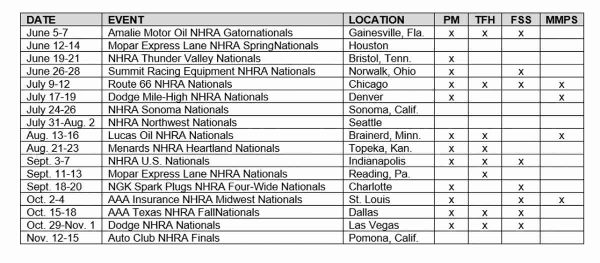 The new schedule will comprise 12 total events for Pro Mod, 10 total events for Top Fuel Harley (the category participated in the first two national events of the season), eight events for Factory Stock Showdown and four events for Mountain Motor Pro Stock.