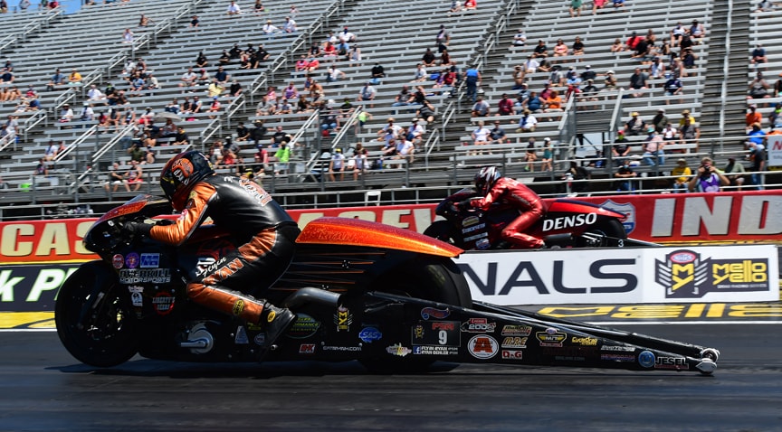 Only Stanfield made it past the first round but was stopped in the quarters by his Elite Motorsports teammate and reigning, three-time champion Erica Enders. Line had to battle teammate Greg Anderson in the semis while Coughlin had to dispense with Elite teammate Enders in order to reach the final round. Coughlin remains the points leader, with Line just eight points behind him, while Enders, Kenny Delco, Bo Butner, Chris McGaha, Alex Laughlin, Anderson, Matt Hartford and Stanfield make up the top 10. This class will not be racing at Lucas Oil Raceway this coming weekend. The E3 Spark Plugs NHRA Nationals marked the start of the Pro Stock Motorcycle season, which had intended to begin at Gainesville, so the two-wheeled set hadn’t turned a wheel in anger in nearly nine months. During Sunday’s passes, that was evident by the second-round fouls. it was difficult to cut a light in the tension-filled eliminations and, while some of the riders we expected to see in the second round made that trip to the water box, they weren’t effective once the burnout was complete.