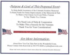 The November Littleton cruise had an ideal day for the get together, almost 70 degrees and sunny , also John presented his idea for a veteran`s cruise/ car show to take place next year on August 15th, the 70 th anniversary of the European peace treaty. I think it will be a worthwhile endeavor for the Colorado car people.