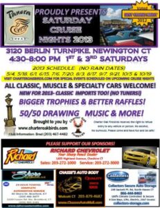 Charter Oak Firebirds car club hosts a cruise night twice each month at Panera Bread on the Berlin Turnpike in Newington, CT. The cruise schedule and information about the club can be seen at www.charteroakbirds.com.