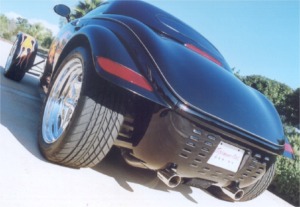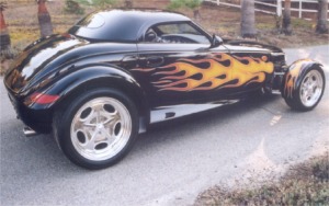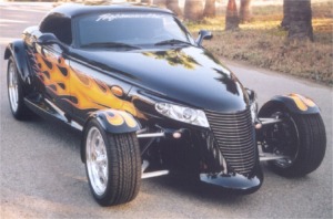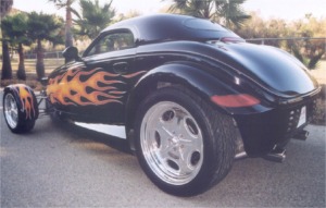 Squeezed into tight peg-legged jeans, a black leather jacket and motorcycle boots rapping out a staccato beat on the asphalt, our bad boy heads for his wheels, the totem of his manhood, his independence, parked under the neon at the edge of the road house lot. His rod is the Prowler California Kid, a coal black vision with vivid flames licking down the sides of the tapered hood that barely contains the high performance engine lurking inside. The Prowler California Kid is throbbing with power, flickering in tune to the pulsing neon, an adrenaline rush waiting to happen. The concept of the bad boy is as old as time. It reached its pinnacle in the 1950’s and enjoyed a revival in the early ‘70’s thanks to the mega hit American Graffiti, where it all came together with the right cast, the right sound track and the perfect set of wheels. The revival became a swell of incredible proportion that is still growing. Unlike Tom Wolfe, you can to back, to that magic time of bravado, daring and rebellion. Just slip into the Prowler California Kid, lite off the blown mill and head out to where the action is. Back in 1990, when the idea of a retro-rod first appeared on an index card at Chrysler’s Pacifica Design Center in Carlsbad, California, the designers dreamed of the marriage of hot rod passion mated with revolutionary technology. A rod that prowled the steamy streets of a more complex world; a blade runner that could take us back emotionally to the days when bad boys were totally cool. The design team of Performance West Group took the result of the 1990 “Idea Fair”, the limited production Prowler, and peeled away the layers to expose the Prowler California Kid that waited for release, just under the skin. The inspiration for the Prowler California Kid was none other than the legendary California Kid. A hammered, wildly flamed ’34 three window coupe built by Pete Chapouris, ‘The Kid embodied the essence of the quintessential bad to the bone rod. This was a vehicle that carved its own legend on the street and as the “hero” of a movie of the same name in the early ‘70’s. The Prowler may be thoroughly modern under its aluminum and composite skin, yet it’s infused with the gene pool of the classic hot rod, with its narrow, pointed prow, sweeping body contours and low, sinister stance. The perfect starting point for the creation of the Prowler California Kid, a modern version of ‘The Kid. With this classic revival as the canvas, the Prowler was subjected to all of the traditional hot rod mods. The bumpers were stripped away, the body was sprayed with countless coats of Sherwin Williams gloss black paint and a set of bold, vivid graphic flames were expertly laid down by Mike Face. |