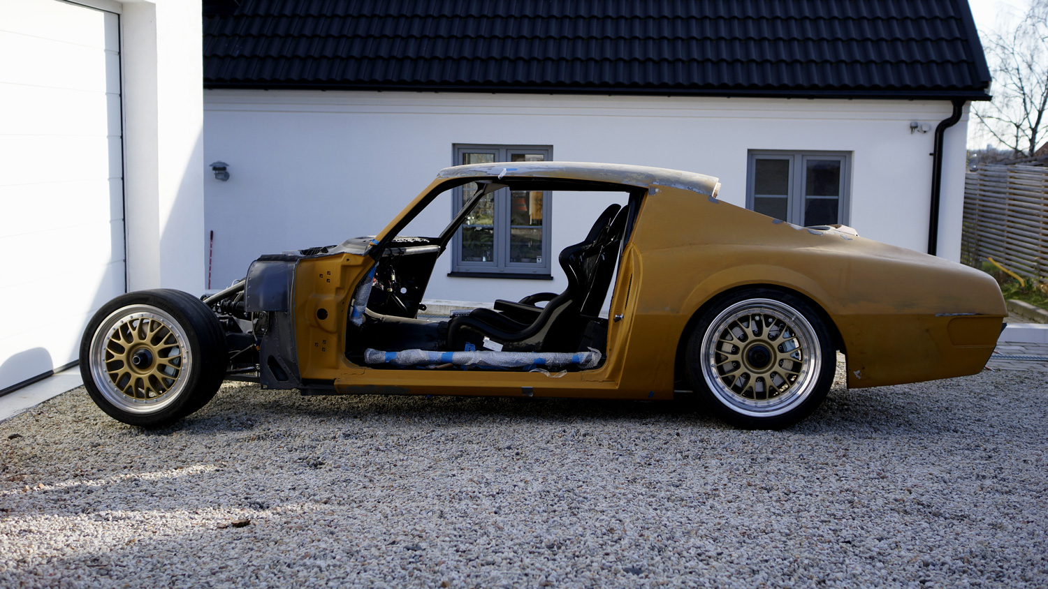 With the front wheels, slicks and the FIA-approved, leather-wrapped seats in place, this was beginning to look like an actual car and not a gorgeous collection of parts. The Pro Touring premise was obvious to the (informed) bystander now.