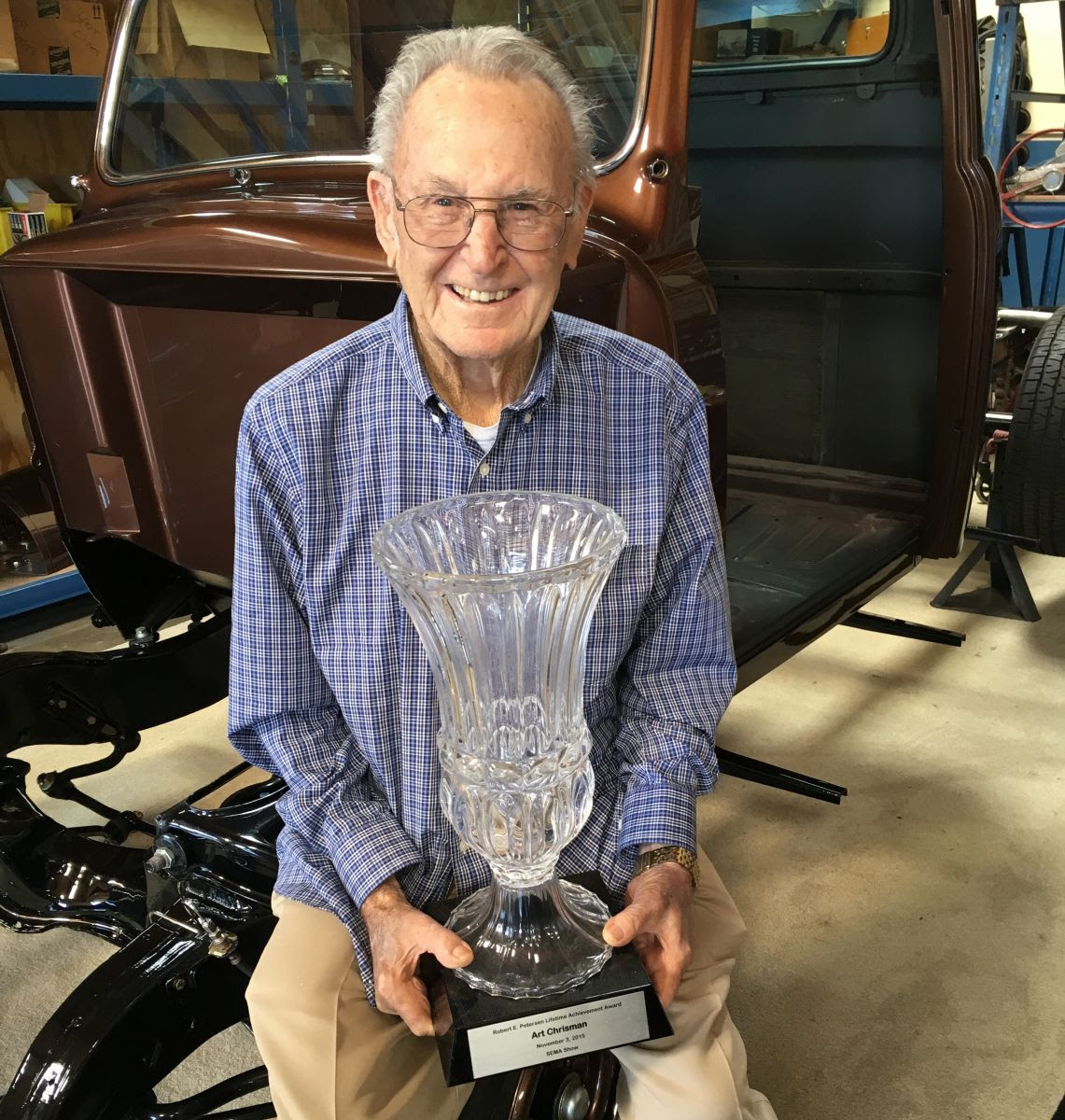 Art Chrisman continues to serve as an inspiration to racers and automotive engineers worldwide. The Petersen Automotive Museum was proud to honor him with the 2015 Robert E. Petersen Lifetime Achievement Award at the annual Specialty Equipment Market Association (SEMA) Awards Breakfast. Barry Meguiar, host of the popular, long-running “Car Crazy” show on the Velocity Network and President of Meguiar’s Car Care Products, announced the award with Petersen Automotive Museum Executive Director Terry L Karges. Art Chrisman accepted the award from Barry Meguiar via a video that was shown to the capacity crowd of thousands in Las Vegas.