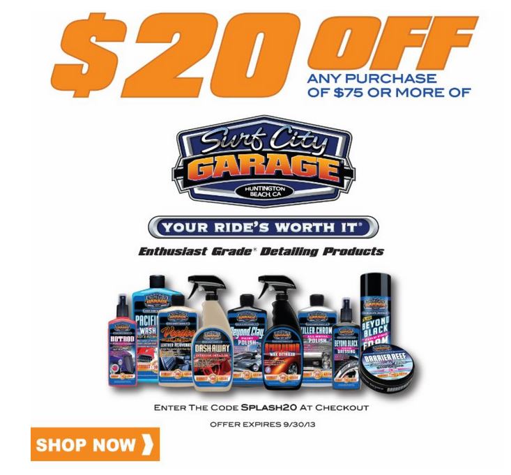 From now until the end of September 2013, Surf City Garage is offering a $20 discount on any purchase of $75 or more. Simply enter the code SPLASH20 at checkout.
