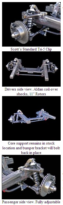 Scott’s Tri-5 is the only full front end clip on the market today. It can be either bolted or welded on depending on your preference. It comes with all factory bumper holes and core support, so your stock sheet metal will bolt back in place. This clip can be ordered in either a standard coilover or Superslam airbag configuration. You can choose either depending on preference.